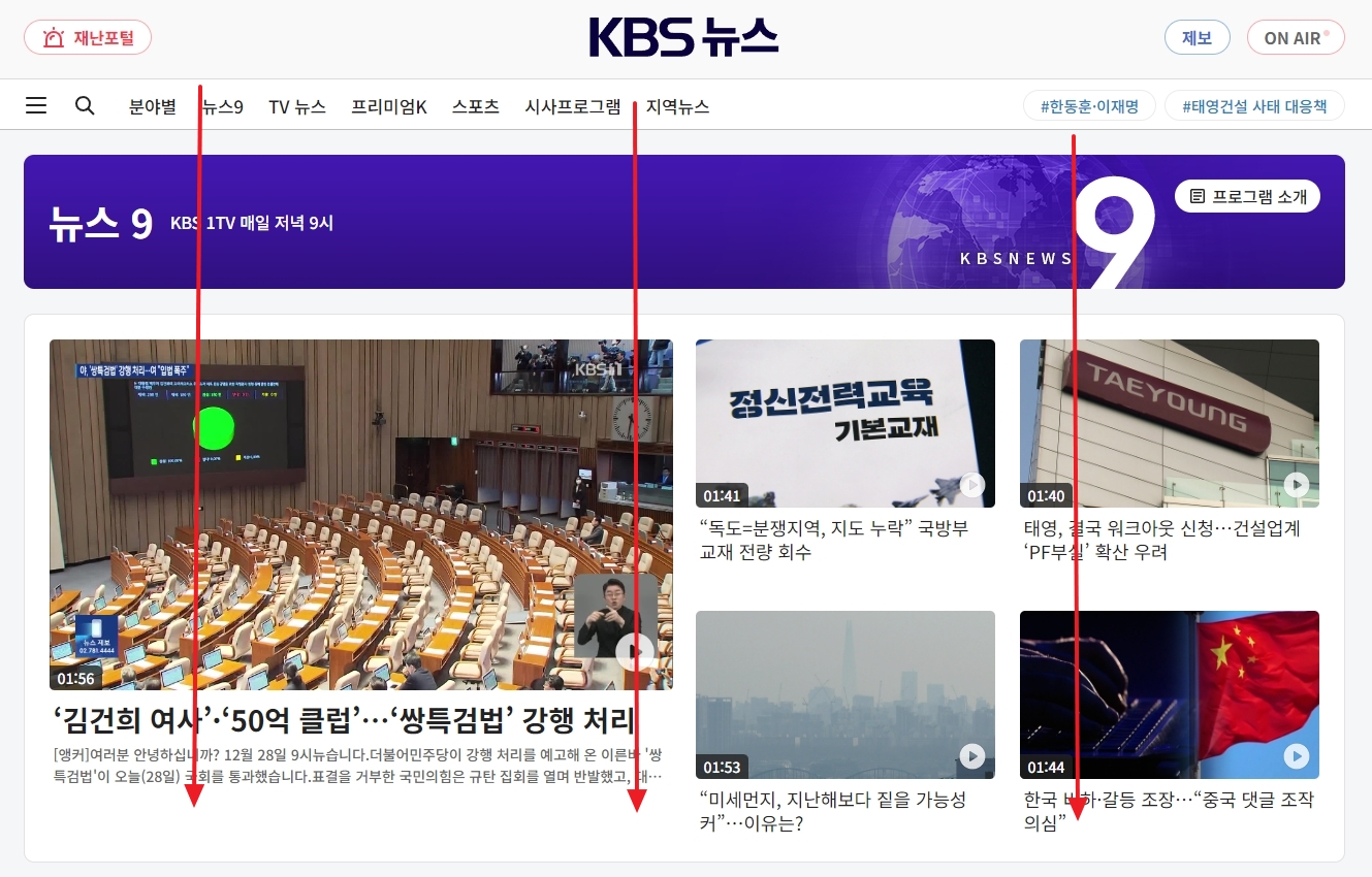공식 홈페이지 메인 화면에 들어가시면 위쪽에 현재 가장 많은 분들이 시청하고 있는 인기 소식들이 먼저 눈에 띄실 겁니다. 오늘 하루 어떤 이슈가 가장 뜨거웠는지 단숨에 파악하기 좋죠.