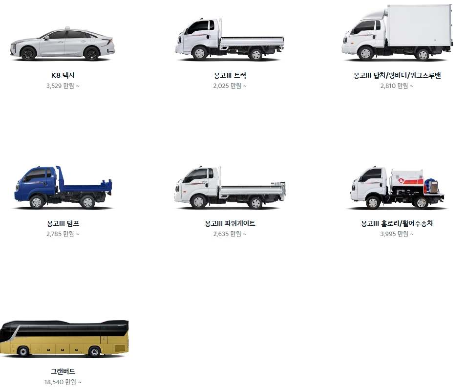 기본 봉고 트럭부터 덤프, 냉동탑차, 심지어 대형 승객 수송을 위한 그랜버드 버스까지 정말 다양합니다. 생업과 직결되는 만큼 본인의 업무 환경에 가장 잘 맞는 모델을 깐깐하게 따져보시고 좋은 선택하시길 바랍니다!
