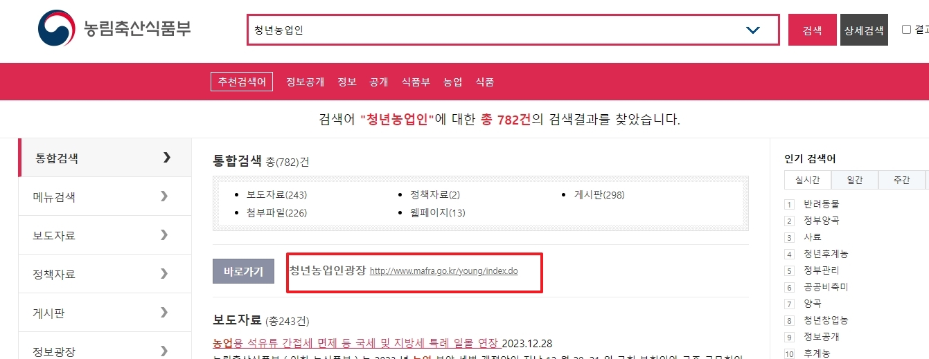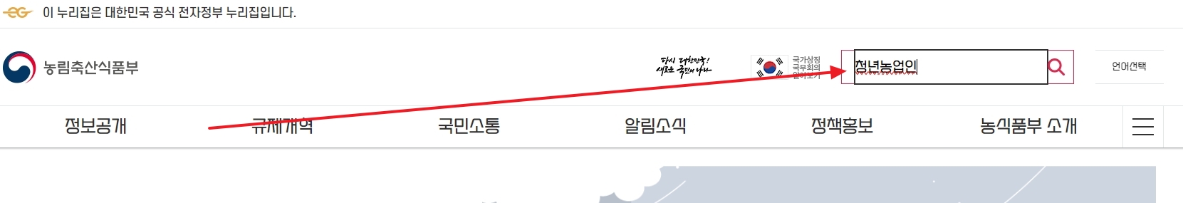 홈페이지에 들어가셨다면 우측 상단에 있는 검색창을 활용해 보세요. 거기에 '청년농업인'이라고 치신 다음, 청년들을 위한 광장 바로가기 메뉴를 눌러서 들어가시면 됩니다.