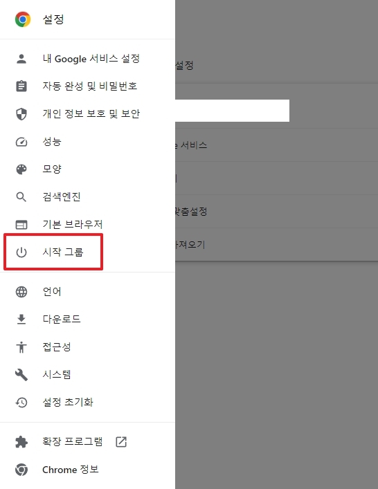 바로 시작 그룹이라는 항목입니다. 이 부분을 눌러주셔야 우리가 원하는 대로 인터넷 첫 화면을 바꿀 수 있습니다. 가끔 못 찾고 헤매시는 분들도 계신데, 왼쪽 카테고리를 천천히 훑어보시면 금방 눈에 띌 겁니다.