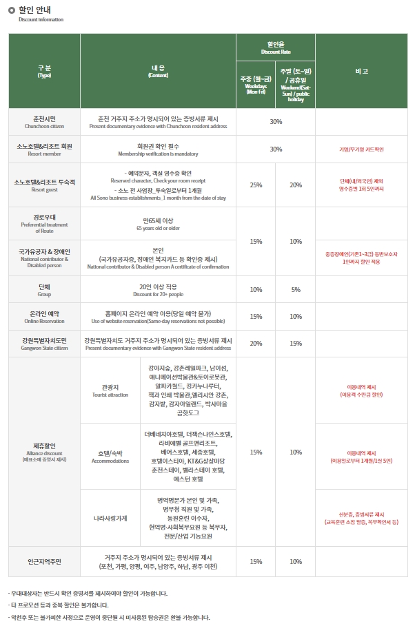 구분 할인율 (주중/주말) 춘천시민 30% / 30% 리조트 회원 30% / — 장애인·국가유공자 15% / 10% 단체 (20인 이상) 10% / 5% 댓글