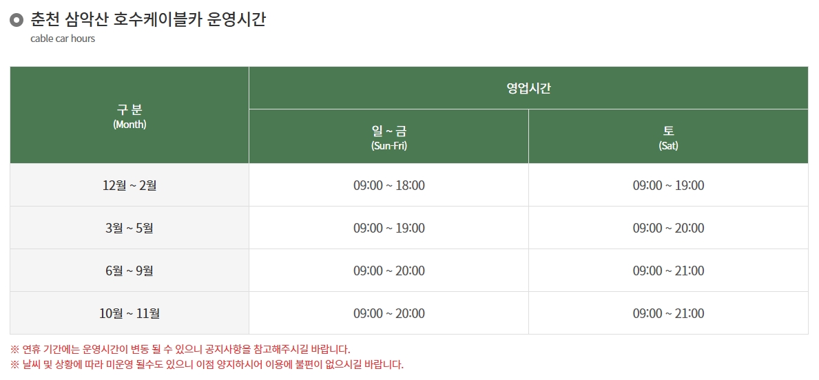 기간 평일 (일~금) 토요일 12월~2월 09:00~18:00 09:00~19:00 3월~5월 09:00~19:00 09:00~20:00 6월~9월 09:00~20:00 09:00~21:00 10월~11월 09:00~20:00 09:00~21:00 연휴 및 날씨 상황에 따라 달라질 수 있으니 공지사항을 참고해주세요.