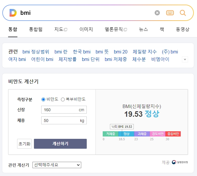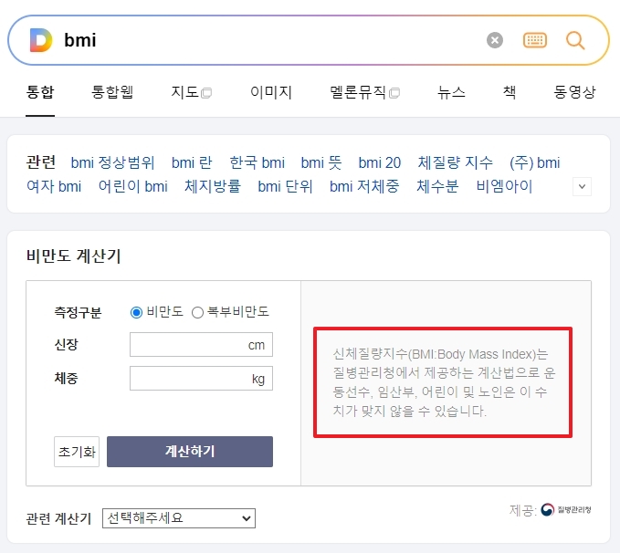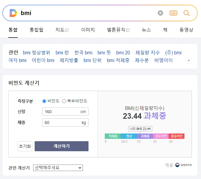 1. 정상 몸무게를 계산하기 위해 BMI(Body Mass Index)를 검색하면 비만도 계산기가 나옵니다. 신체질량지수(BMI)는 질병관리청에서 제공하는 계산법으로, 이 지수는 일반적인 상황에서 유용하지만, 운동선수, 임산부, 어린이 및 노인의 경우에는 맞지 않을 수 있습니다.