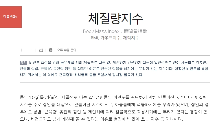 5. 다음백과에서 BMI를 검색해보면 체질량지수가 나옵니다. 다음백과에 따르면, BMI는 비만도를 측정하기 위해 몸무게를 키의 제곱으로 나눈 값입니다. 계산하기 간편하기 때문에 일반적으로 많이 사용되고 있지만, 인종, 성별, 근육량, 유전적 원인 등 다양한 이유로 단순하게 적용하기에는 무리가 있습니다. 정확한 비만도를 측정하기 위해서는 근육량과 허리둘레 등을 포함한 추가 검사가 필요합니다.