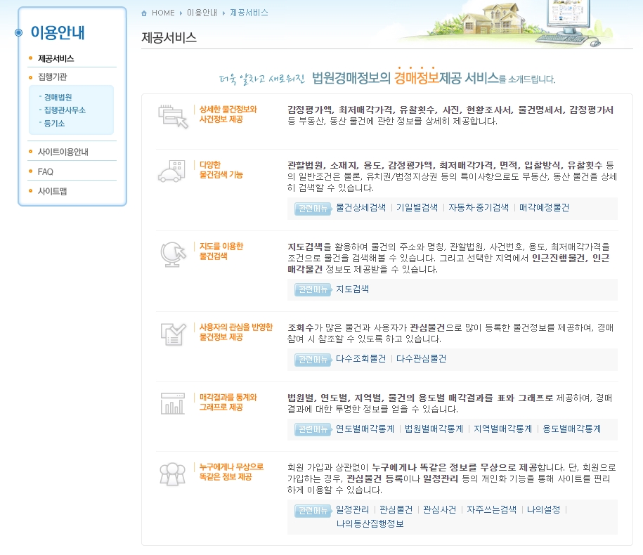 6. 제공 서비스 탭을 클릭합니다. 법원경매정보의 다양한 서비스에 대해 소개하고, 사용자가 활용할 수 있는 기능들을 안내합니다. 여기에는 상세한 물건 정보 제공, 다양한 물건 검색 기능, 지도를 이용한 물건 검색, 사용자 관심 물건 반영한 추천 정보 제공, 매각 결과 통계 제공 등이 포함됩니다. 각 서비스의 구체적인 사용 방법과 이점을 설명하여 사용자가 최대한 활용할 수 있도록 돕습니다.