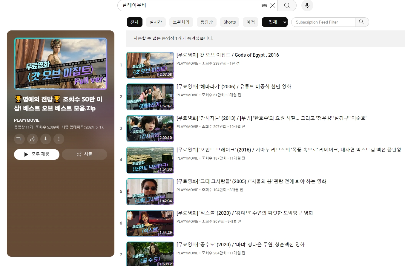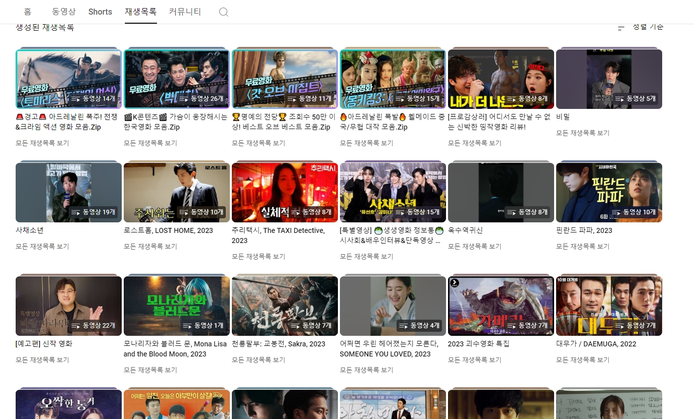 4. 재생목록 메뉴를 클릭하면 조회수가 높은 영화들이나 장르별로 정리된 재생목록을 볼 수 있습니다. 예를 들어, 액션, 로맨스, 코미디 등 다양한 장르의 영화들이 잘 정리되어 있어 원하는 영화를 쉽게 찾을 수 있습니다.