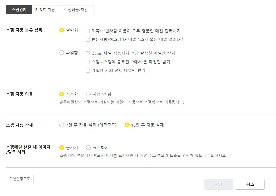 7. 마지막으로 스팸 관리 메뉴에서 스팸 메일 필터링 옵션을 설정할 수 있습니다. 스팸 자동 분류 항목을 설정하여 원치 않는 메일을 효과적으로 차단할 수 있습니다.