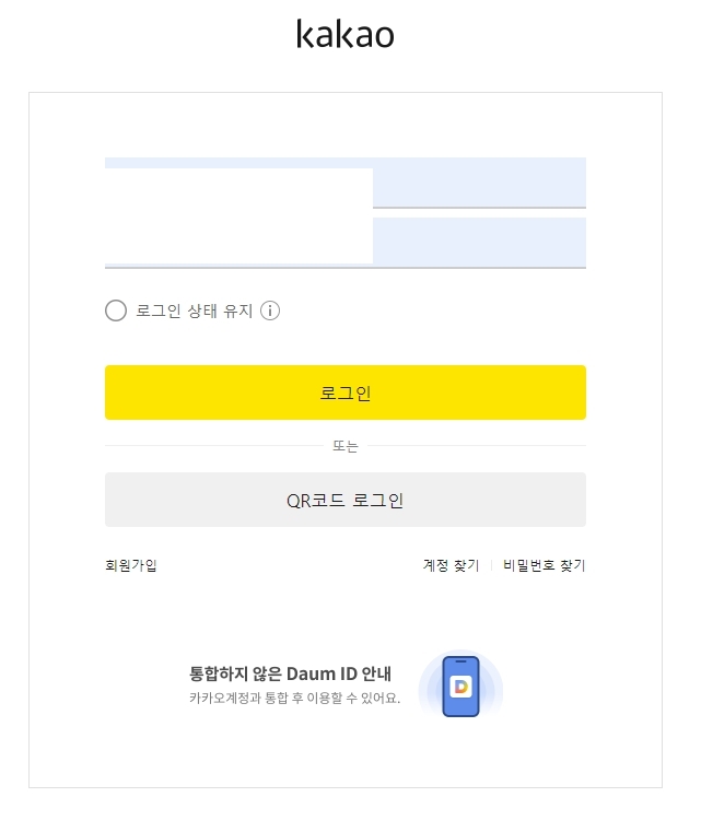 2. 카카오계정으로 로그인 버튼을 클릭하면 카카오 계정 로그인 화면이 나타납니다. 여기서 자신의 카카오 계정 정보로 로그인합니다. 계정이 없으면 회원가입을 통해 계정을 만들어야 합니다.
