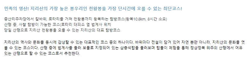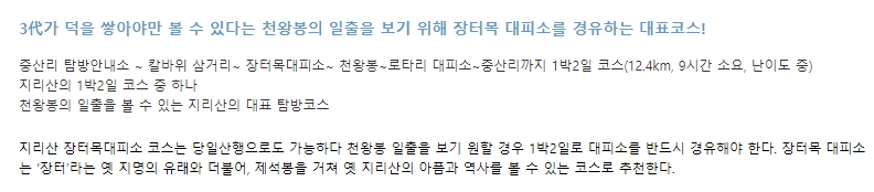 3. 이 코스는 지리산을 전체적으로 경험하고 싶은 이들에게 추천되며, 도전적인 경로를 선호하는 등산객에게 적합합니다. 천왕봉 일출은 이 코스의 하이라이트 중 하나로, 많은 사람들이 이 경험을 위해 이 코스를 선택합니다.