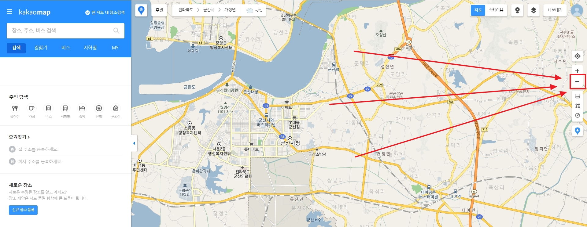 2. 지도 화면 우측에 있는 '-' 버튼을 클릭하여 지도를 축소합니다. 지도를 축소하면 더 넓은 지역을 볼 수 있습니다.
