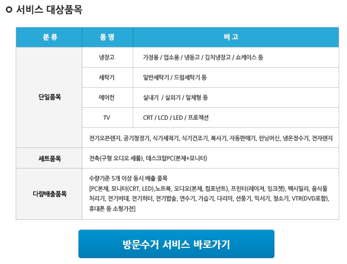 4. 서비스 대상품목으로는 냉장고, 세탁기, 에어컨, TV, 식기세척기, 복사기, 전축, pc본체, 모니터, 노트북 등이 있는데 이 중에서 다량 배출품목은 아래에서도 설명하겠지만 단일품목이 있을 경우 1개도 가능하나 단일품목이 없다면 5개 이상 배출해야 방문 수거가 가능합니다.