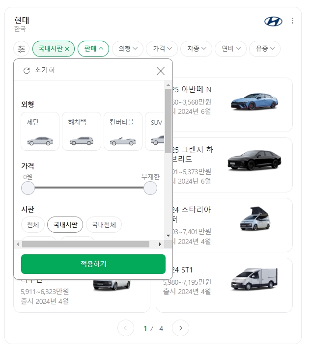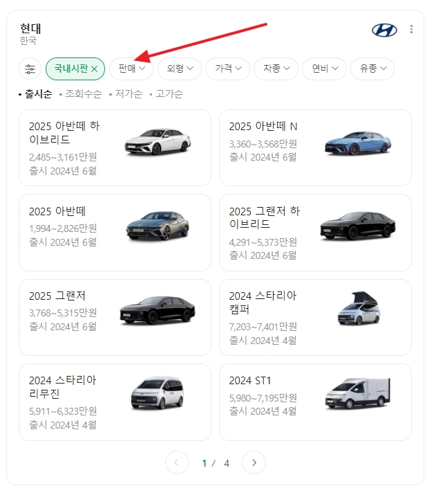 3. 상단 메뉴 중에 판매 버튼을 클릭하면 더 자세한 옵션을 선택할 수 있어요. 국내 시판, 국내 전체, 해외 시판, 해외 전체 등으로 분류돼 있어서 내가 원하는 판매 상태를 쉽게 확인할 수 있습니다. 또, 차종 선택도 가능해서 세단, SUV, 해치백 등 내가 원하는 차종만 골라서 볼 수 있어요. 이렇게 분류가 잘 되어 있어서 원하는 정보를 찾기 편리해요.