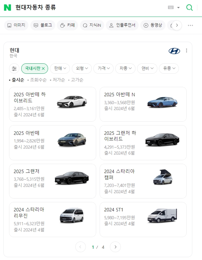 2. 검색창에 현대 자동차 종류라고 입력해요. 그러면 현재 국내에서 시판 중인 현대차 모델들이 쭉 나오는데, 최신 모델부터 인기 모델까지 한눈에 확인할 수 있어서 너무 편해요. 검색 결과는 차량의 사진과 함께 간단한 정보가 나와서 어떤 차인지 바로 알 수 있어요.