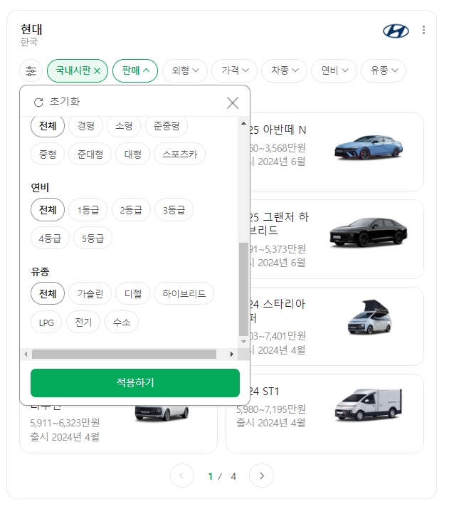 5. 아래쪽에는 연비와 유종도 확인할 수 있어요. 전기차만 따로 보고 싶다면 전기차 필터링 기능도 있어서 전기차에 관심 있는 사람들한테는 아주 편리해요. 연비는 요즘 중요한 요소니까, 이 정보를 쉽게 확인할 수 있어서 좋습니다. 전기차, 하이브리드, 가솔린, 디젤 등 원하는 연료 타입을 선택할 수 있어요.