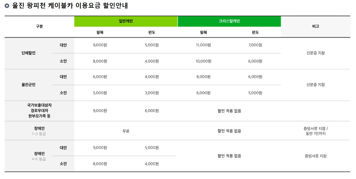 - 크리스탈캐빈(왕복): 대인 12,000원 / 소인 11,000원