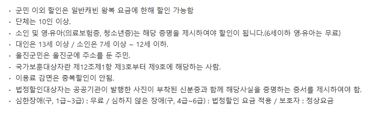 - 단체(10명 이상), 울진군민, 국가보훈대상자 등 다양한 할인 대상이 있어요.