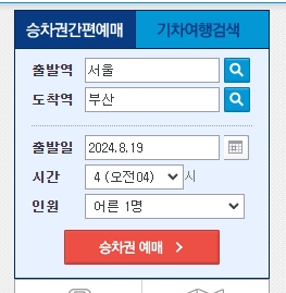 3. 해당 버튼을 클릭하면 평소와 같은 예매 페이지로 이동하게 되며, 여기에서 출발역, 도착역, 출발일, 시간, 인원 등을 선택하여 기차표를 예약할 수 있습니다.