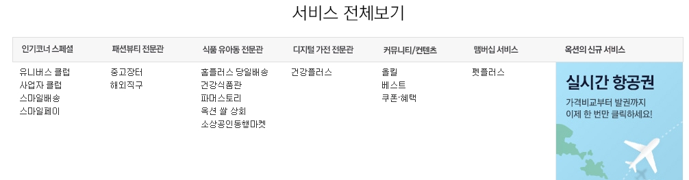5. 서비스 전체보기 메뉴에서는 인기코너 스페셜, 패션뷰티 전문관, 식품 유아동 전문관, 디지털 가전 전문관, 커뮤니티/컨텐츠, 멤버십 서비스 등 옥션에서 제공하는 다양한 서비스들을 한눈에 확인할 수 있어요. 실시간 항공권 조회와 같은 옥션의 신규 서비스도 이 메뉴를 통해 쉽게 접근할 수 있어요.