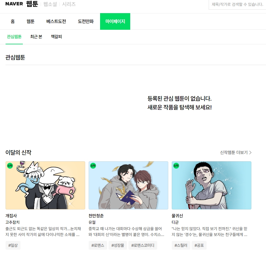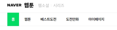 2. 홈페이지 상단의 메뉴에서는 홈, 웹툰, 베스트도전, 도전만화, 마이페이지를 찾을 수 있어요. 이곳에서 각 메뉴를 통해 웹툰을 감상하거나, 내가 등록한 관심 웹툰을 관리할 수 있어요.