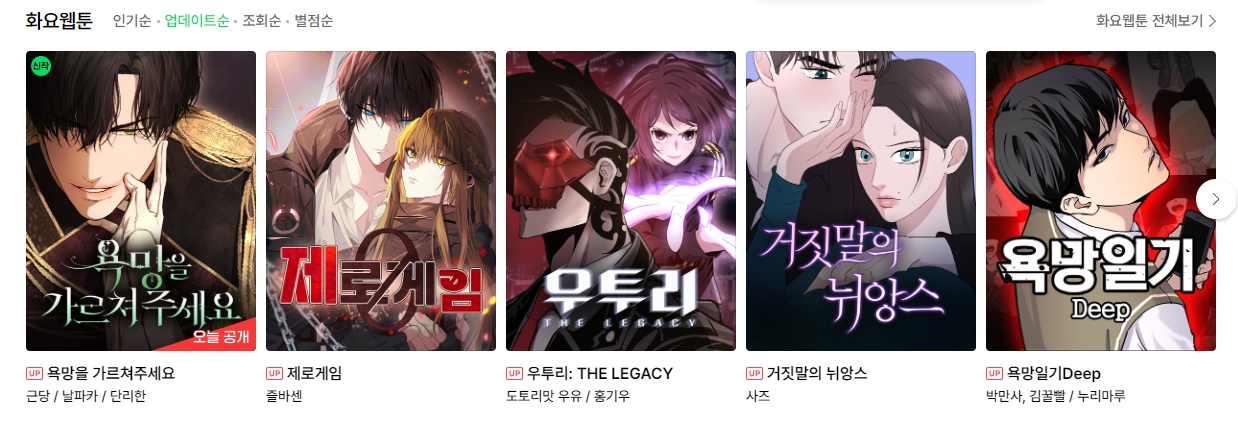 3. 화요일 업데이트된 최신 웹툰 리스트를 확인할 수 있어요. 다양한 장르의 웹툰이 매일 업데이트되며, 최신 인기작을 놓치지 않고 감상할 수 있도록 구성되어 있어요.