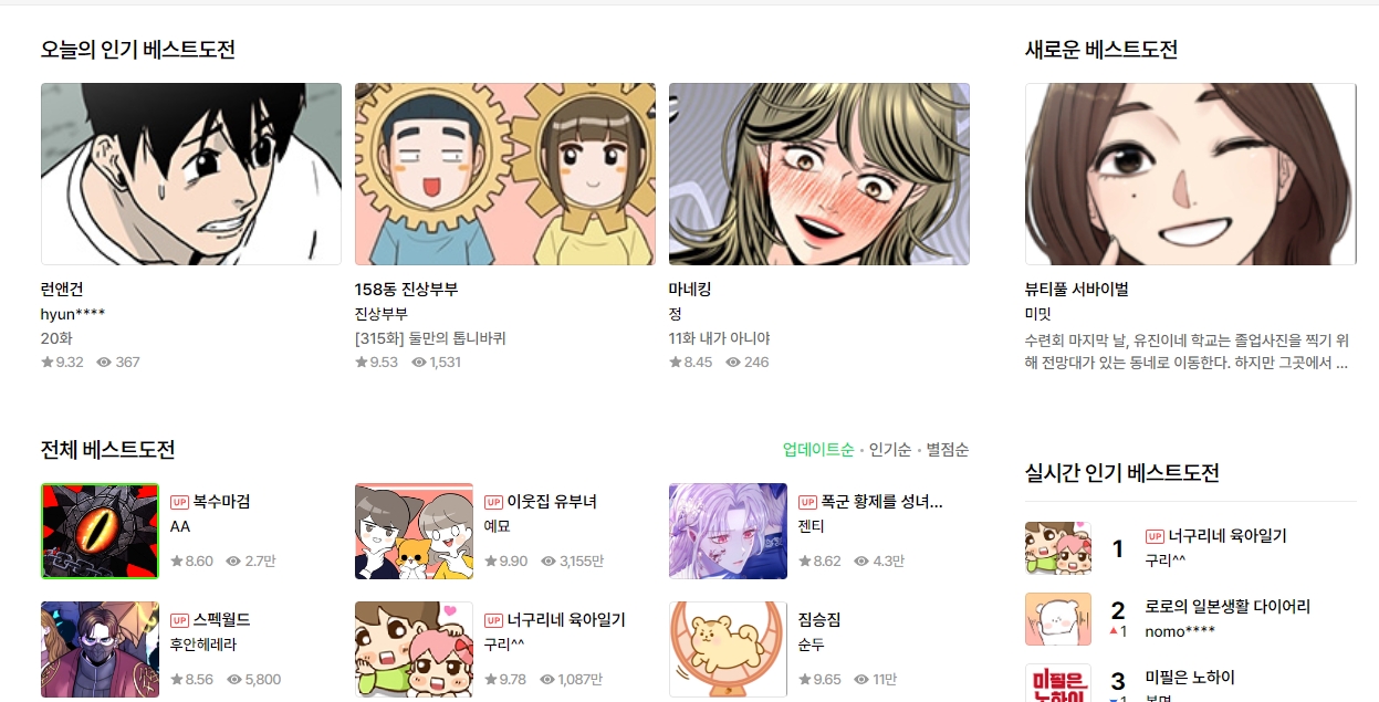 5. 베스트도전과 도전만화에서는 신인 작가들의 다양한 작품을 만나볼 수 있어요. 이곳은 아직 정식 연재 전의 작품들이 모이는 곳으로, 재능 있는 작가들이 자신만의 이야기를 펼치는 공간이에요.