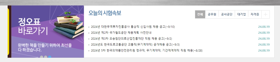 3. 오늘의 시험속보 섹션에서는 최신 채용 정보와 시험 공고를 실시간으로 확인할 수 있어요. 여기서는 주로 신입사원 채용 공고, 공채 일정, 서류 접수 마감일 등의 중요한 정보를 빠르게 업데이트합니다. 이를 통해 취업을 준비하는 사람들은 놓치기 쉬운 중요한 일정을 미리 파악하고 대비할 수 있습니다. 이러한 정보는 취업 준비생들에게 매우 유용하며, 기회를 놓치지 않도록 돕습니다.