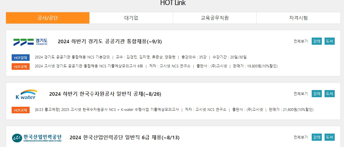 4. HOT Link 메뉴에서는 인기 있는 공사/공단, 대기업, 교육공무직원, 자격시험 관련 정보를 한눈에 볼 수 있어요. 이 메뉴에서는 특히 공채 시즌에 맞춰 주요 기업들의 채용 정보를 모아놓아, 빠르게 지원할 수 있도록 도와줍니다. 이 외에도 기업별 채용 팁이나 인적성 검사 대비 자료도 함께 제공되어, 취업 준비에 필요한 모든 것을 한 곳에서 해결할 수 있습니다.