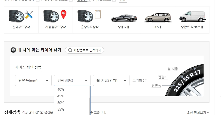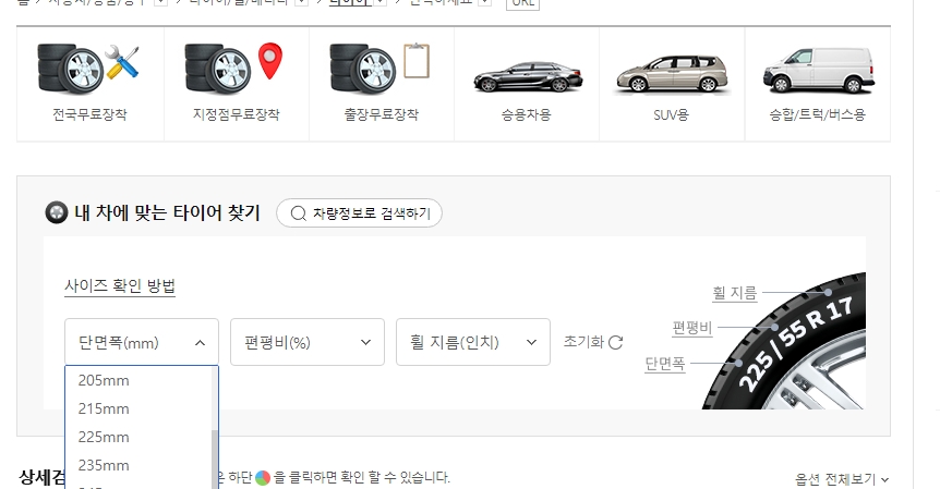 5. 차종을 선택하여 타이어를 검색할 수도 있고, 직접 원하는 사이즈를 선택할 수도 있습니다. 이 두 가지 방법을 통해, 본인의 차량에 적합한 타이어를 손쉽게 찾을 수 있습니다.