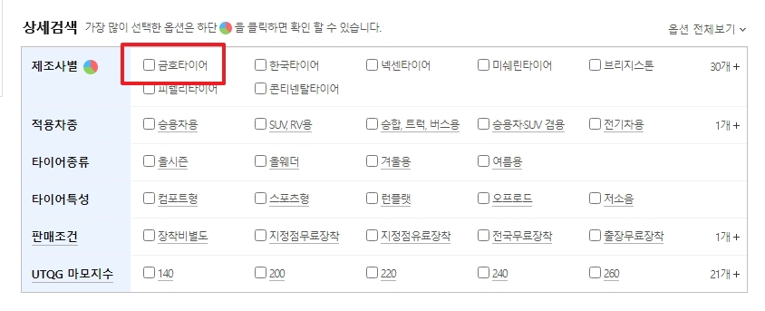 6. 타이어 사이즈나 차종을 선택한 후, 제조사 목록에서 금호타이어를 클릭합니다. 이 선택을 통해 금호타이어 제품들만 필터링하여 볼 수 있으며, 다양한 모델과 가격을 확인할 수 있습니다.