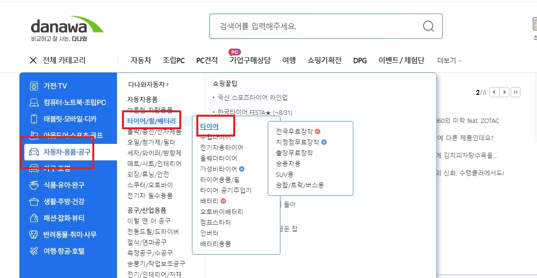 3. 카테고리 목록에서 자동차 항목을 선택한 후, 이어서 타이어를 클릭합니다. 그런 다음, 세부 메뉴에서 다시 타이어를 선택하여 타이어 관련 제품 목록으로 이동합니다.