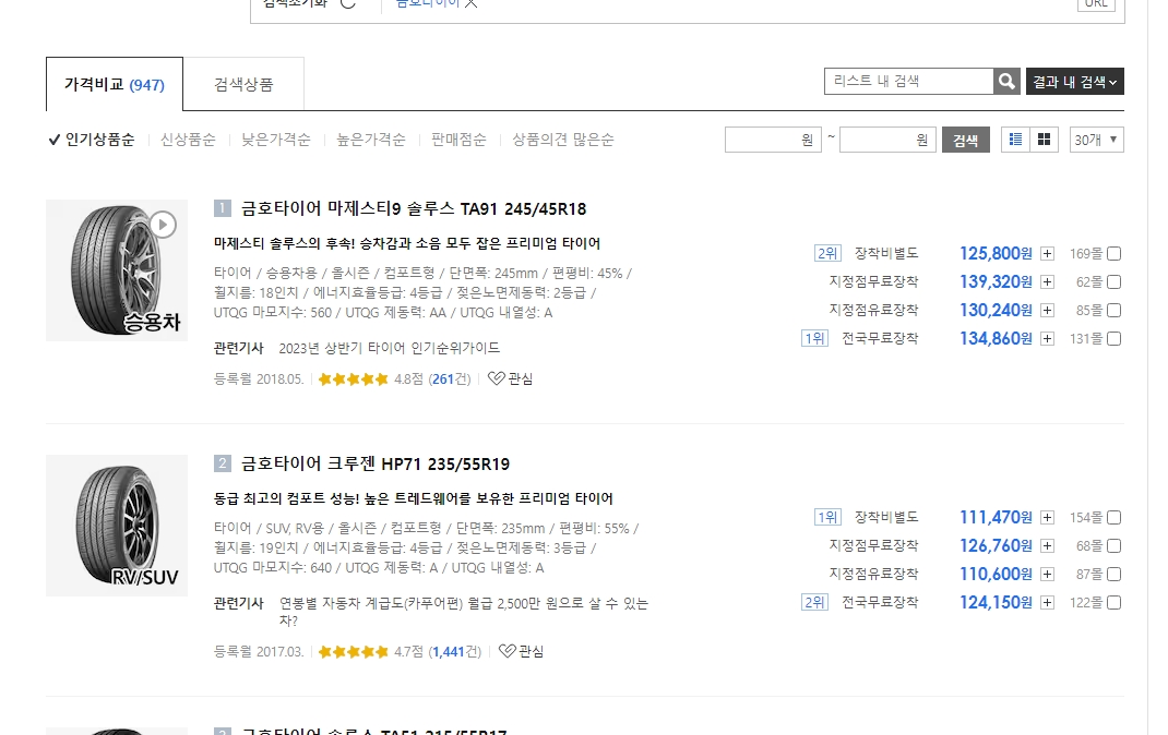 먼저, 다나와에 접속한 후, 검색창에 금호타이어를 입력하고 검색하면 다양한 모델과 가격이 나열된 페이지로 이동하게 됩니다. 여기서 원하는 타이어 모델을 선택하면, 해당 모델의 판매처와 가격이 쭉 나와요. 이때, 가격뿐만 아니라 배송비나 장착비가 포함된 최종 가격을 반드시 확인해야 합니다. 일부 판매처는 기본 가격이 저렴해 보이지만, 추가 비용이 붙을 수 있기 때문에 최종 결제 금액을 잘 확인하는 것이 중요합니다.