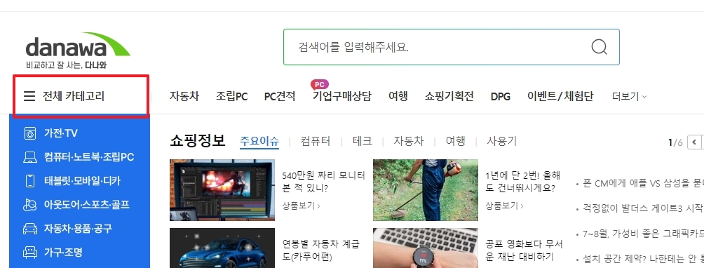 2. 홈페이지 좌측에 위치한 전체 카테고리 버튼을 클릭합니다. 이 버튼을 통해 다양한 제품군에 접근할 수 있으며, 타이어 관련 정보를 찾기 위한 첫 단계입니다.