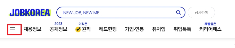2. 홈페이지에 접속한 후, 좌측 상단에 위치한 메뉴 버튼을 클릭합니다. 이 메뉴 버튼은 잡코리아의 다양한 기능과 정보를 탐색할 수 있는 출발점입니다. 여기서 원하는 정보를 찾기 위한 여러 카테고리를 확인할 수 있습니다.