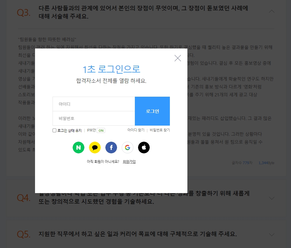 9. 하지만 더 많은 샘플을 확인하려면 로그인이 필요합니다. 스크롤을 내리다 보면 로그인 요청이 나타나며, 로그인을 해야 추가적인 자기소개서 샘플이나 세부적인 정보를 열람할 수 있습니다. 로그인 후에는 더 많은 샘플을 무제한으로 확인할 수 있어, 자기소개서 작성에 큰 도움이 됩니다.