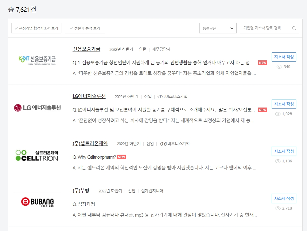 6. 잡코리아에는 총 7621건의 합격자 자기소개서가 등록되어 있습니다. 이 방대한 자료 중에서 몇 가지를 클릭하여 읽어보았습니다. 이 샘플들은 다양한 직무와 기업에 최적화된 자기소개서로, 각기 다른 스타일과 접근법을 보여줍니다.