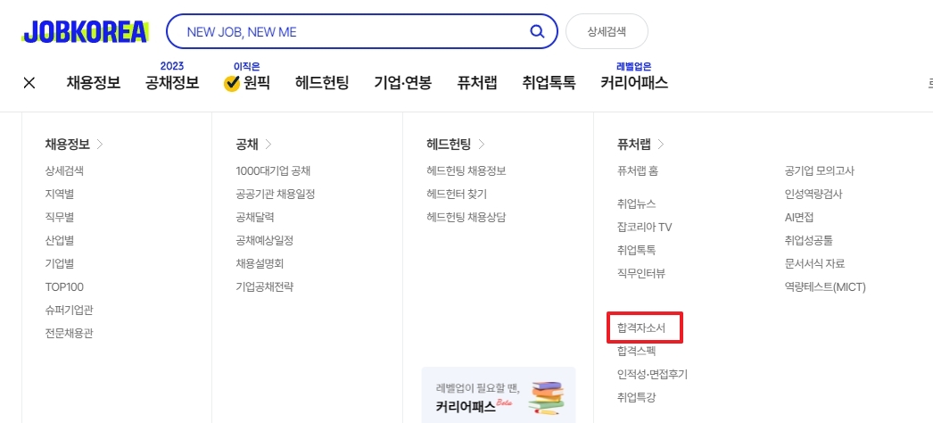 3. 메뉴에서 퓨처랩을 선택한 다음, 합격자소서 항목을 클릭합니다. 합격자소서 섹션은 실제로 서류 합격한 사람들의 자기소개서를 모아둔 곳으로, 많은 구직자들이 참고하는 중요한 자료입니다.