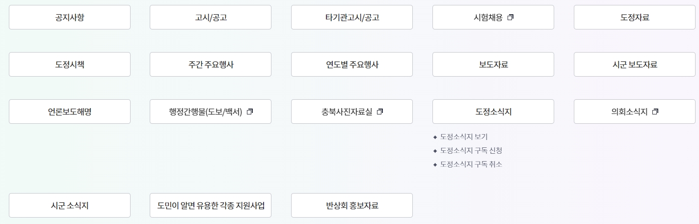 8. 마지막으로 도정정책 메뉴입니다. 이 메뉴에서는 도정 목표 및 전략, 주요 업무 계획, 정책 실명제 등을 확인할 수 있습니다. 충청북도의 정책 방향과 관련된 중요한 정보를 제공하여 도민들이 정책의 방향성을 이해할 수 있도록 돕습니다.