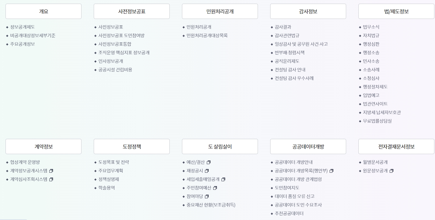 3. 두 번째로는 사진정보공표 메뉴가 있습니다. 이 메뉴에서는 사진 정보공표, 도민참여방, 조직운영 핵심지표 정보 공개, 공공시설 건립비용 등을 확인할 수 있습니다. 특히, 도민들이 참여할 수 있는 정보가 포함되어 있어 참여를 장려합니다.