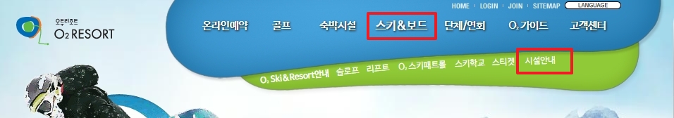 상단 메뉴에서 스키&보드 및 시설안내 확인하기