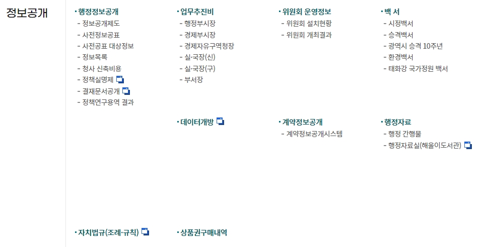 5. 정보 공개 메뉴에서는요, 울산시가 투명한 행정을 위해 다양한 정보를 공개하고 있어요. 행정 정보 공개, 정책 실명제, 계약 정보 공개 같은 메뉴들이 잘 준비되어 있죠. 데이터 개방이나 행정 자료도 여기서 한 번에 확인할 수 있어요.