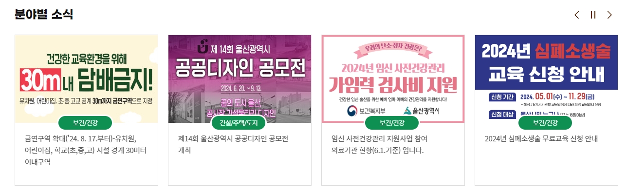 10. 분야별 소식에서는 울산시에서 진행 중인 주요 공지사항과 이벤트 등을 확인할 수 있어요. 건강한 교육환경을 위한 금연 구역 지정, 공공 디자인 공모전, 임신 사전 건강관리 지원 같은 다양한 소식들이 안내되어 있습니다. 울산시의 여러 가지 중요한 정보들이 모두 이곳에 모여있어서 꼭 한번 확인해보시면 좋을 것 같아요.