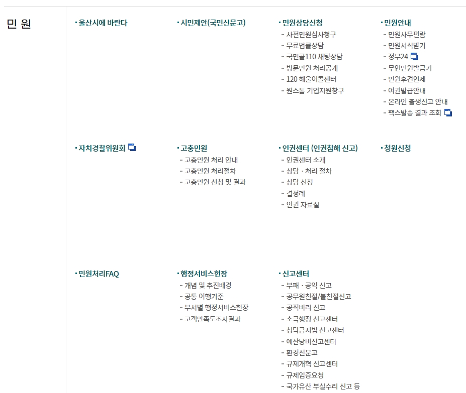 3. 민원 메뉴에서는 다양한 민원 서비스가 정말 잘 갖춰져 있어요. 울산시에 바란다 코너라든지, 시민 제안, 그리고 민원 상담 신청 같은 여러 기능이 있어서 민원 관련 서비스도 간편하게 이용하실 수 있죠. 민원을 처리하는 방법도 상세하게 안내되어 있어요.