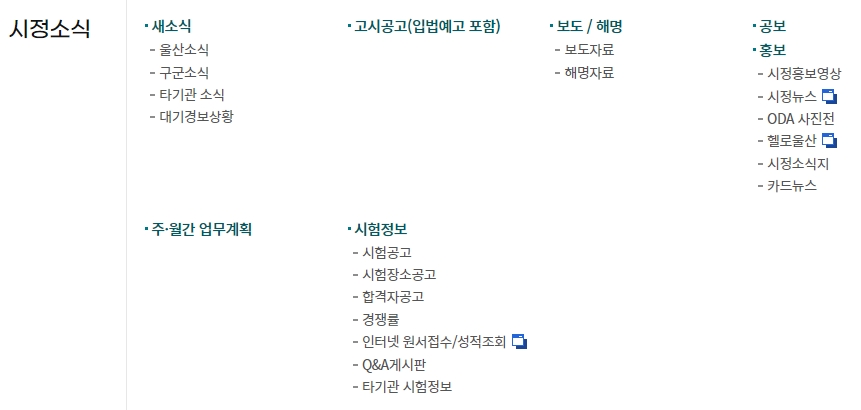 6. 시정 소식 메뉴에서는 울산시의 최신 소식들을 접하실 수 있어요. 시정 주요 업무 계획이나 새 소식, 그리고 주간이나 월간 업무 계획 같은 것들도 다루고 있어서 울산시의 다양한 활동을 바로 확인할 수 있죠. 시험 정보나 공시 공고 같은 중요한 정보들도 빠지지 않구요.