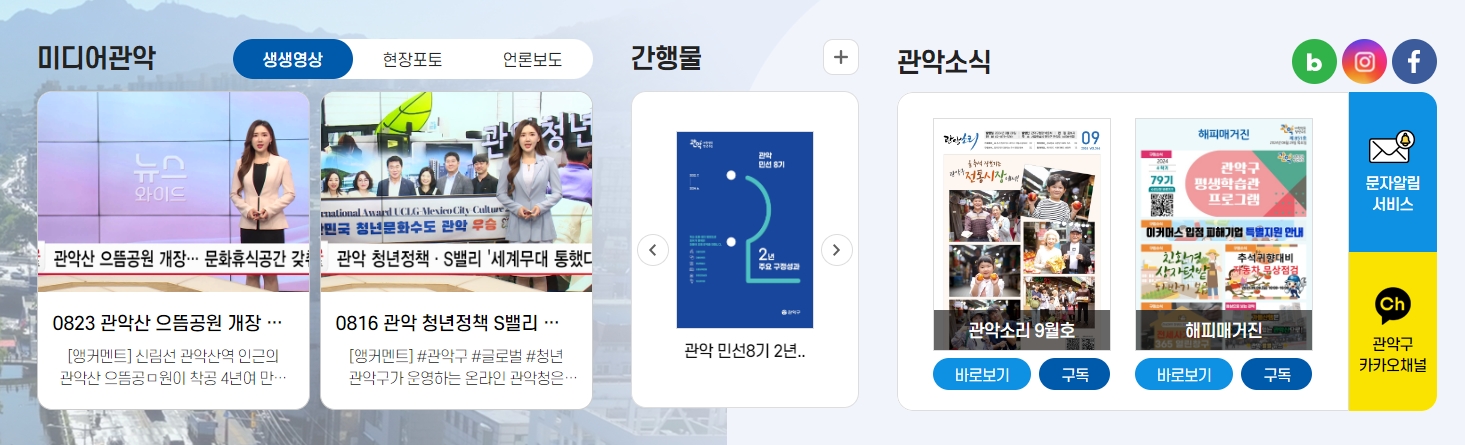 6. 관악소리, 해피매거진, 소셜미디어, 미디어센터, 문자알림서비스 등 다양한 미디어 콘텐츠를 제공하여, 관악구민들이 다양한 채널을 통해 정보를 얻을 수 있도록 돕고 있어요. 예를 들어, 관악소리와 해피매거진은 지역 주민들의 이야기와 생활 정보를 담아내며, 소셜미디어와 문자알림서비스는 실시간으로 중요한 공지사항이나 이벤트 정보를 전달해 줍니다. 이를 통해 관악구민들은 언제 어디서나 필요한 정보를 손쉽게 받을 수 있어요.