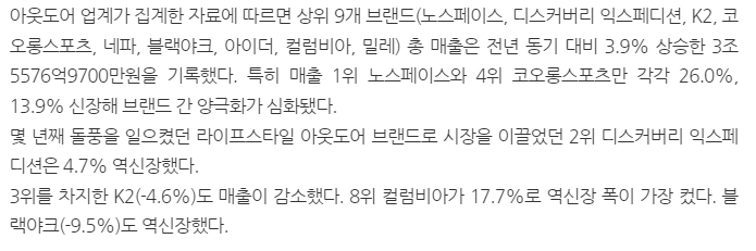 그 밖에 아이더는 2,668억 원의 매출과 -3.3%의 신장률을, 컬럼비아는 1,332억 원의 매출과 -17.7%의 신장률로 고전하고 있습니다. 밀레는 916억 원의 매출과 -2.9%의 신장률로, 매출 상위권에서는 가장 낮은 매출을 기록했습니다.