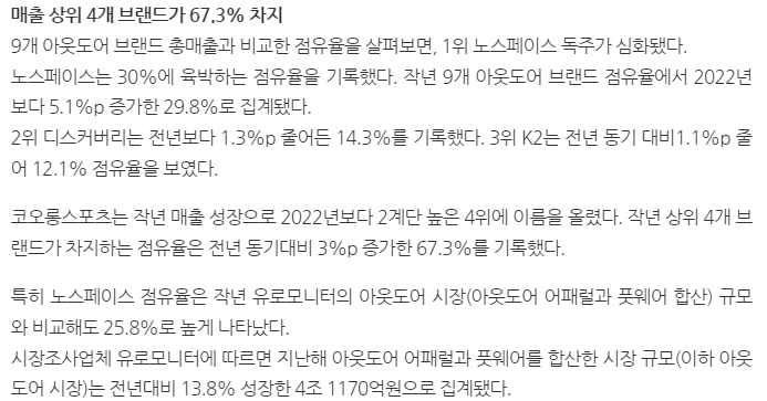 7. 마지막으로 아웃도어 브랜드들의 시장 점유율에 대한 분석을 보면서, 상위 4개 브랜드가 전체 시장의 67.3%를 차지하고 있다는 사실에 놀랐어요. 그중에서도 노스페이스가 시장의 약 30%를 차지하며 독보적인 위치를 유지하고 있었는데요, 이 정도 비중이면 다른 브랜드들이 따라오기 쉽지 않겠다는 생각이 들었어요. 디스커버리와 K2도 나름의 위치를 지키고 있었지만, 노스페이스와의 격차를 줄이기는 쉽지 않아 보였습니다.