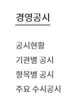 3. 경영공시 메뉴에 들어가니 공시현황, 기관별 공시, 항목별 공시, 주요 수시공시 등 다양한 공시 정보가 제공되고 있었어요. 공공기관의 경영정보를 체계적으로 분류해서 볼 수 있으니 필요한 정보를 쉽게 찾을 수 있었습니다.