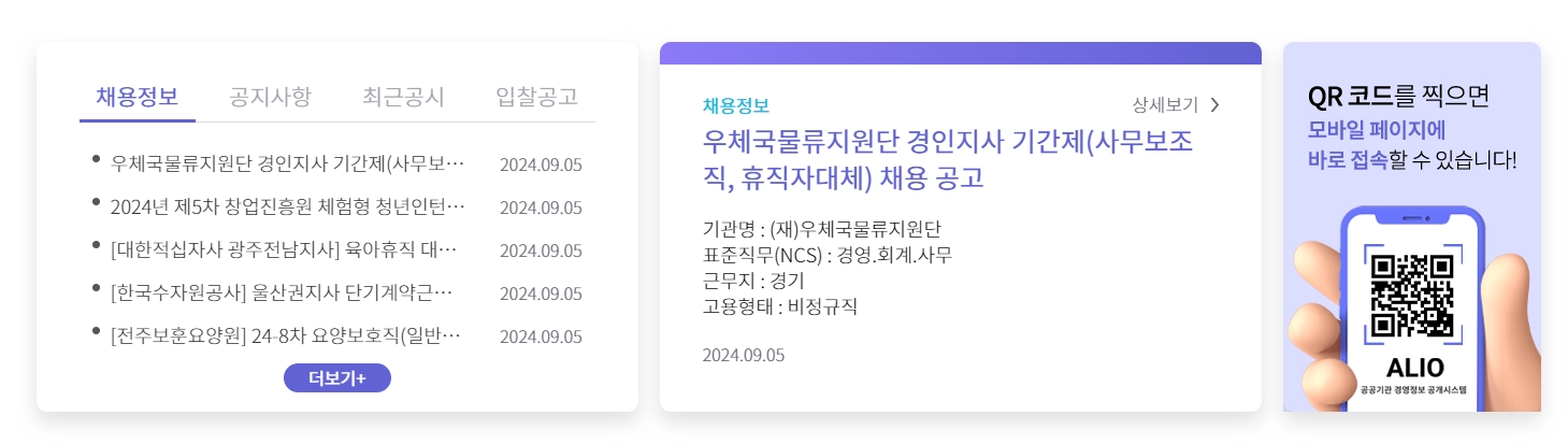 7. 채용정보 메뉴에서는 공공기관의 최신 채용 공고를 확인할 수 있었어요. 다양한 채용 공고가 날짜별로 정리되어 있어서, 관심 있는 공고를 쉽게 찾아볼 수 있더라구요. 그리고 QR 코드를 찍으면 바로 모바일 페이지로 접속할 수 있는 기능도 있었습니다.