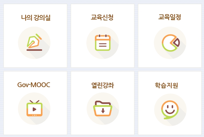 4. 중앙에 위치한 주요 메뉴는 나의 강의실, 교육신청, 교육일정, Gov-MOOC, 열린강좌, 학습지원입니다. 강의를 듣는 학생들이나 공무원들이 학습할 때 꼭 필요한 기능들을 한눈에 볼 수 있도록 배치된 것이 특징이에요. Gov-MOOC는 정부에서 제공하는 온라인 강의로, 많은 사람들이 다양한 주제로 학습할 수 있습니다.