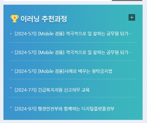5. 이러닝 추천과정은 특정 학습자들이 필요로 할 만한 강의들이 추천되는 코너입니다. 예를 들어 적극적으로 일 잘하는 공무원 되기, 청탁금지법 배우기 같은 강의들이 있는데, 이 강의들은 실제 업무에 바로 적용할 수 있는 실용적인 강의들이라 많은 관심을 받고 있어요.